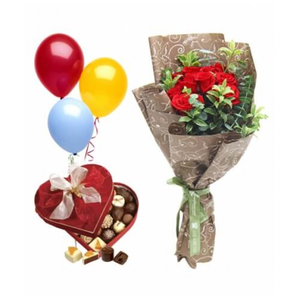 Combo gồm: Bó hoa xinh xắn gồm 10 cành hồng xinh xắn đeỉ6m xuyến hoa lá phụ kiện*Một hộp socola *Một chùm bong bóng